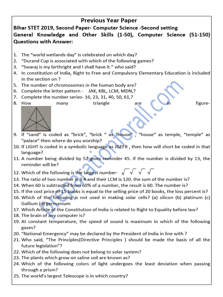 Bihar STET 2019, Second Paper- Computer Science -Second setting