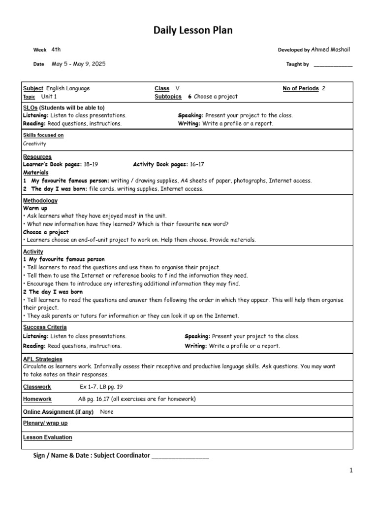 Subject English Language Class V No of Periods 3