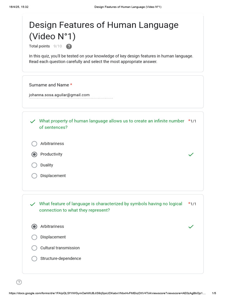 16/4/25, 15:32 Design Features of Human Language (Video N°1)