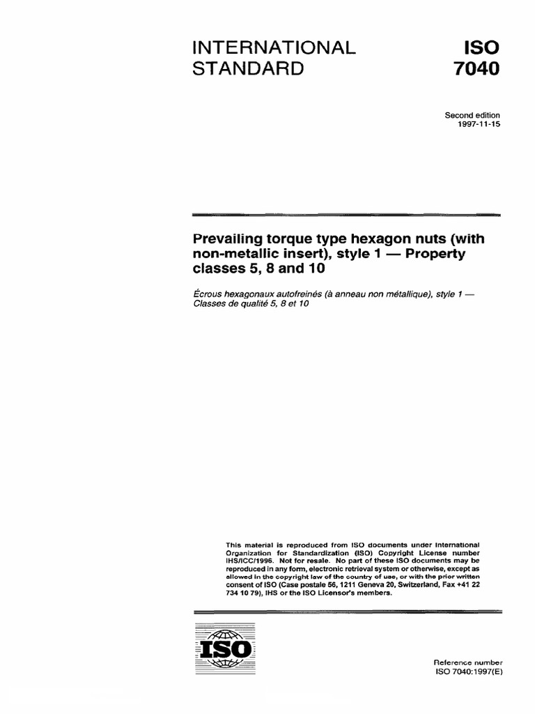IS0 2320: 1997, Prevailing torque type steel hexagon nuts - Mechanical and performance properties.