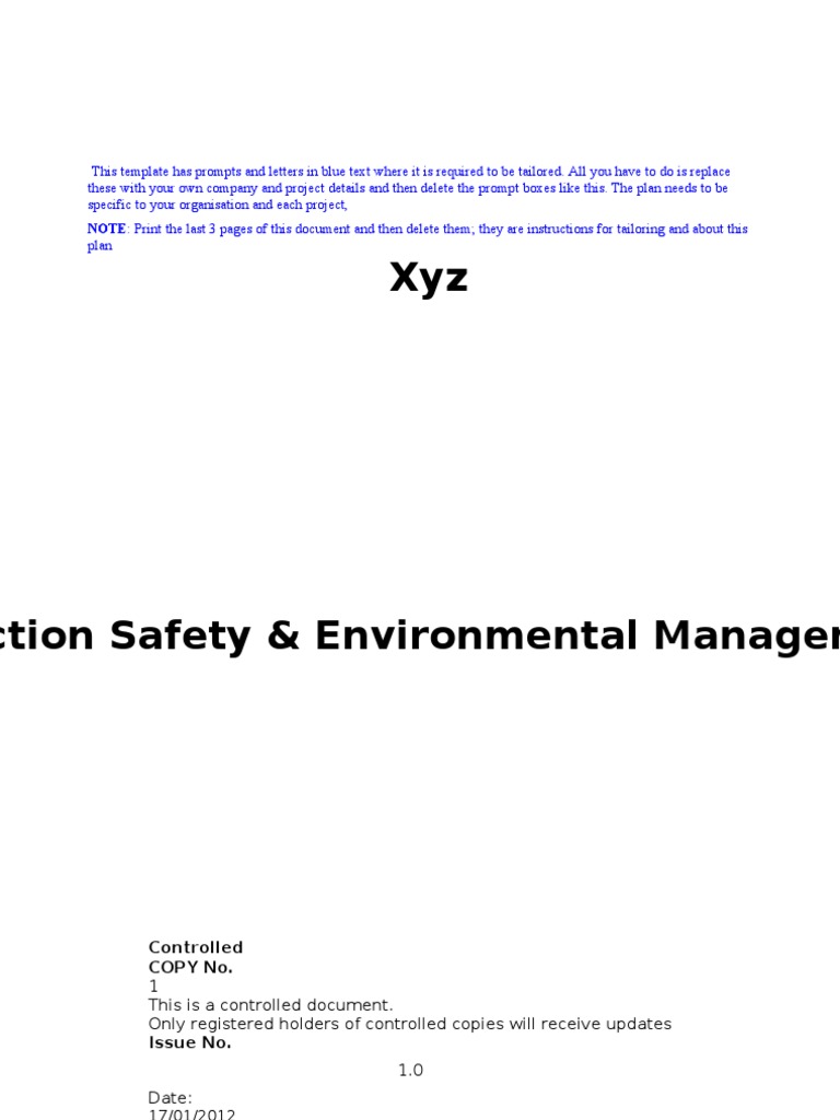 This Construction Safety and Environmental Management Plan (CSEMP) is the prime document for the management of safety and environmental issues in all works undertaken by Xyz. The Plan provides information and guidance on how Xyz will meet all Work Health & Safety and Environmental requirements. By implementing this management plan, Xyz aims to: ensure that personnel working on site, members of the public and visitors to the site are adequately protected from risk of injury or illness ensure that appropriate environmental protection measures are implemented on works undertaken within the work areas.