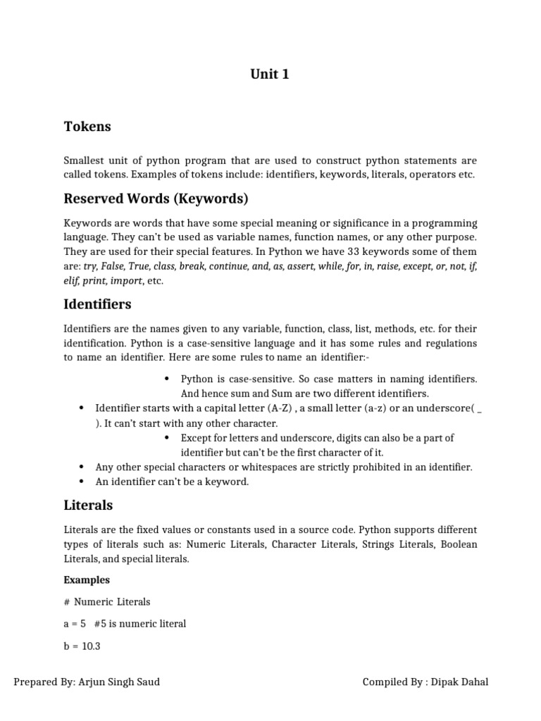types of literals such as: Numeric Literals, Character Literals, Strings Literals, Boolean