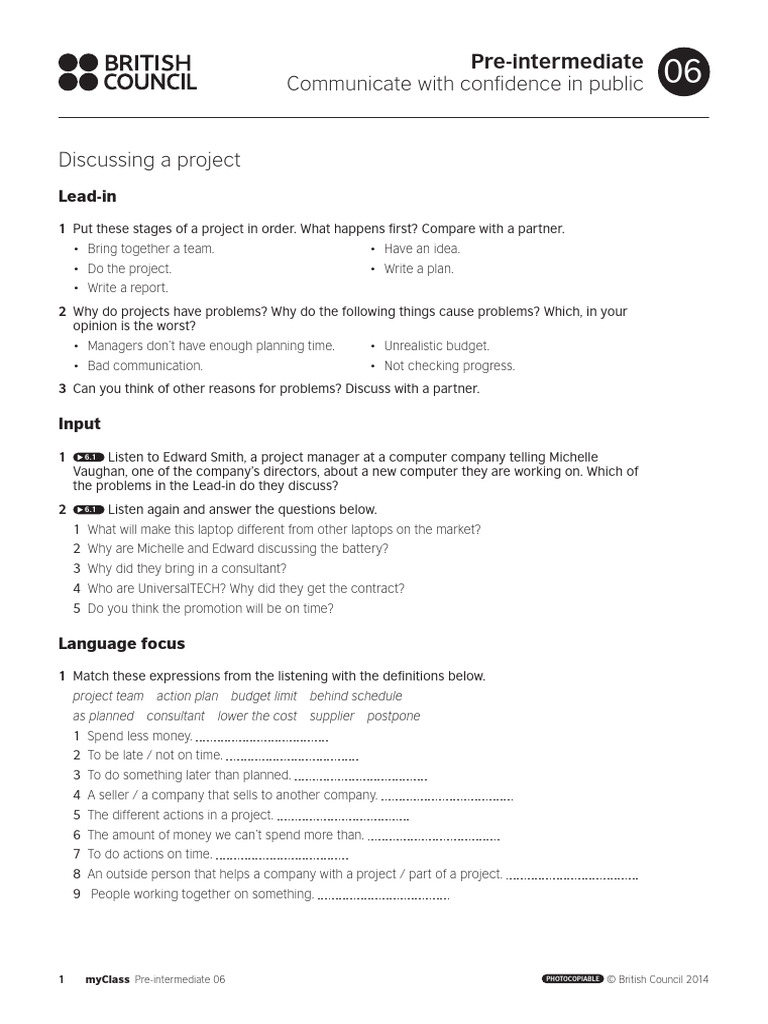 1 myClass Pre-intermediate 06 PHOTOCOPIABLE © British Council 2014