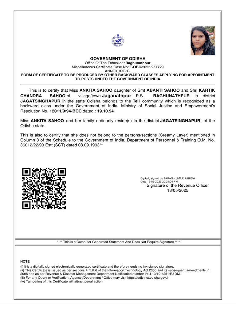Reference No: E-OBC/2025/257729 To View: https://edistrict.odisha.gov.in/t/1Zbhg/72E770A7 Token No: 72E770A7