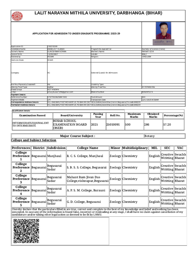 Candidate Name: AMARJEET KUMAR Programme Applied For: Bachelor of Science (Hons)