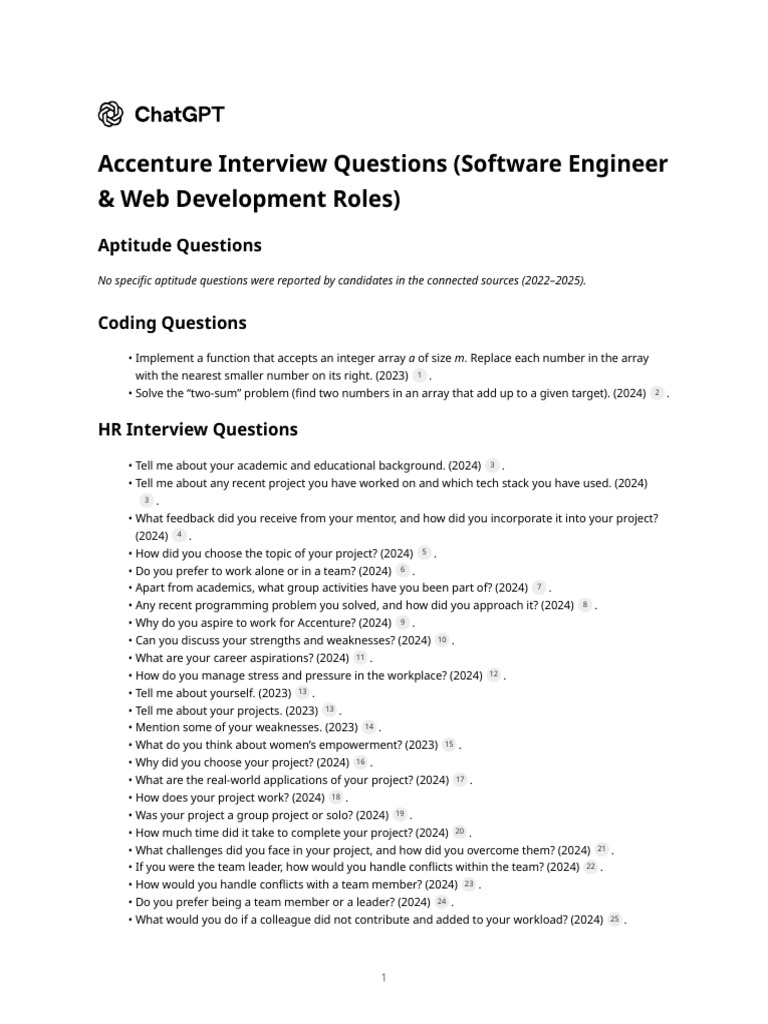 Accenture Software Engineer and Associate Web roles 3 33 . Each question is cited from the respective