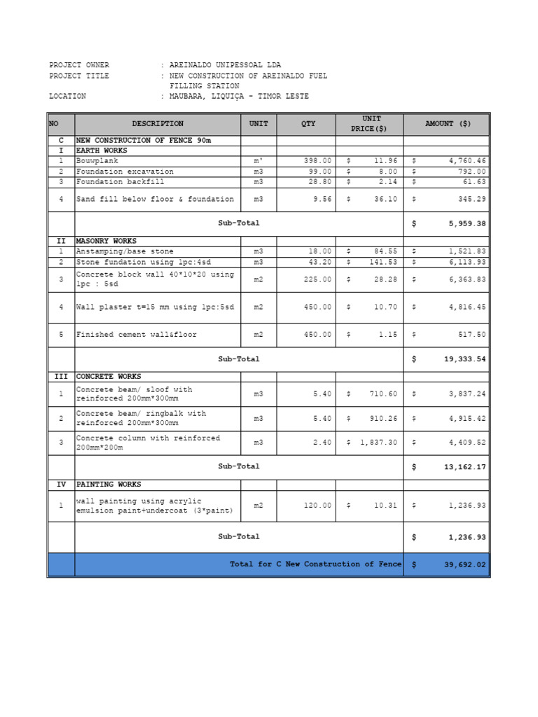 2 Foundation excavation m3 99.00 $ 8.00 $ 792.00