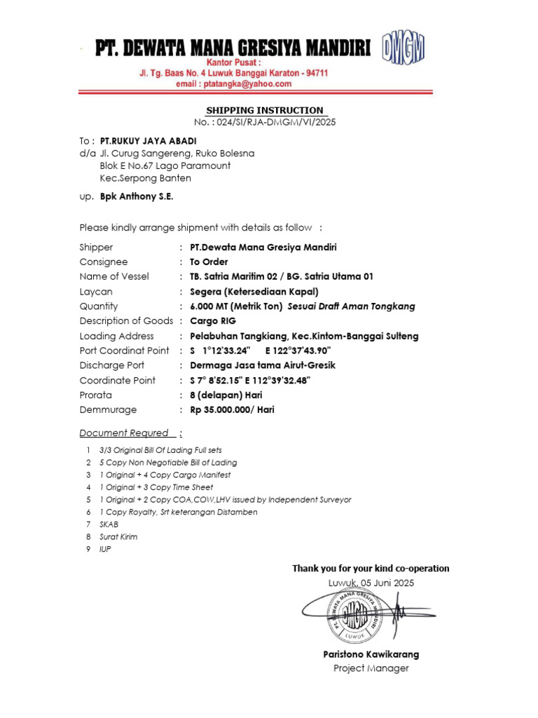 Shipper : PT.Dewata Mana Gresiya Mandiri