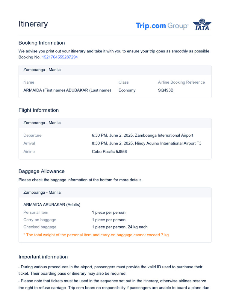 Departure 6:30 PM, June 2, 2025, Zamboanga International Airport