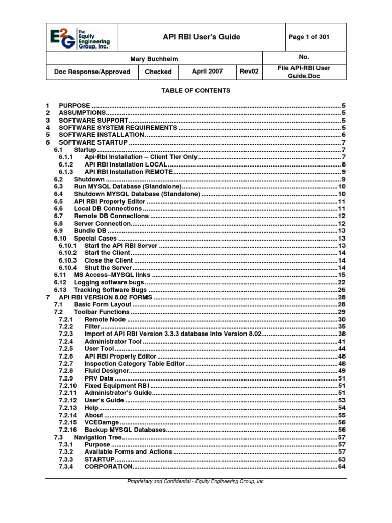 TABLE OF CONTENTS PURPOSE ............................................................................................................................................. 5 ASSUMPTIONS..................................................................................................................................... 5 SOFTWARE SUPPORT ........................................................................................................................ 5 SOFTWARE SYSTEM REQUIREMENTS ............................................................................................ 5 SOFTWARE INSTALLATION............................................................................................................... 6 SOFTWARE STARTUP ........................................................................................................................ 7 6.1 Startup ..........................................................................................................................................7 6.1.1 Api-Rbi Installation Client Tier Only................................................................................. 7 6.1.2 API RBI Installation LOCAL.................................................................................................. 8 6.1.3 API RBI Installation REMOTE............................................................................................... 9 6.2 Shutdown .....................................................................................................................................9 6.3 Run MYSQL Database (Standalone)........................................................................................10 6.4 Shutdown MYSQL Database (Standalone) .............................................................................10 6.5 API RBI Property Editor ............................................................................................................11 6.6 Local DB Connections ..............................................................................................................11 6.7 Remote DB Connections ..........................................................................................................12 6.8 Server Connection.....................................................................................................................12 6.9 Bundle DB ..................................................................................................................................13 6.10 Special Cases ............................................................................................................................13 6.10.1 Start the API RBI Server ..................................................................................................... 13 6.10.2 Start the Client ..................................................................................................................... 14 6.10.3 Close the Client ................................................................................................................... 14 6.10.4 Shut the Server .................................................................................................................... 14 6.11 MS AccessMYSQL links .........................................................................................................15 6.12 Logging software bugs .............................................................................................................22 6.13 Tracking Software Bugs ...........................................................................................................26 7 API RBI VERSION 8.02 FORMS ........................................................................................................ 28 7.1 Basic Form Layout ....................................................................................................................28 7.2 Toolbar Functions .....................................................................................................................29 7.2.1 Remote Node ....................................................................................................................... 30 7.2.2 Filter...................................................................................................................................... 35 7.2.3 Import of API RBI Version 3.3.3 database into Version 8.02........................................... 38 7.2.4 Administrator Tool .............................................................................................................. 41 7.2.5 User Tool .............................................................................................................................. 44 7.2.6 API RBI Property Editor ...................................................................................................... 48 7.2.7 Inspection Category Table Editor ...................................................................................... 48 7.2.8 Fluid Designer...................................................................................................................... 49 7.2.9 PRV Data .............................................................................................................................. 51 7.2.10 Fixed Equipment RBI .......................................................................................................... 51 7.2.11 Administrators Guide......................................................................................................... 51 7.2.12 Users Guide ........................................................................................................................ 53 7.2.13 Help....................................................................................................................................... 54 7.2.14 About .................................................................................................................................... 55 7.2.15 