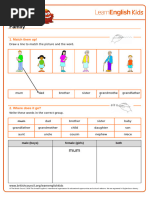 The document is an educational activity focused on family vocabulary for children. It includes matching exercises, categorization of family members, and prompts for drawing and writing about one's family. The content is designed to enhance understanding of family relationships and terminology.