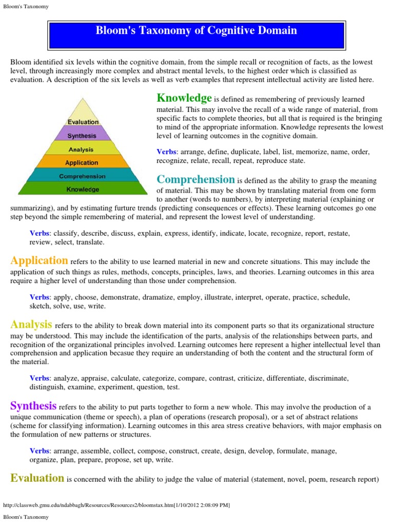 Bloom identified six levels within the cognitive domain, from the simple recall or recognition of facts, as the lowest level, through increasingly more complex and abstract mental levels, to the highest order which is classified as evaluation. A description of the six levels as well as verb examples that represent intellectual activity are listed here.