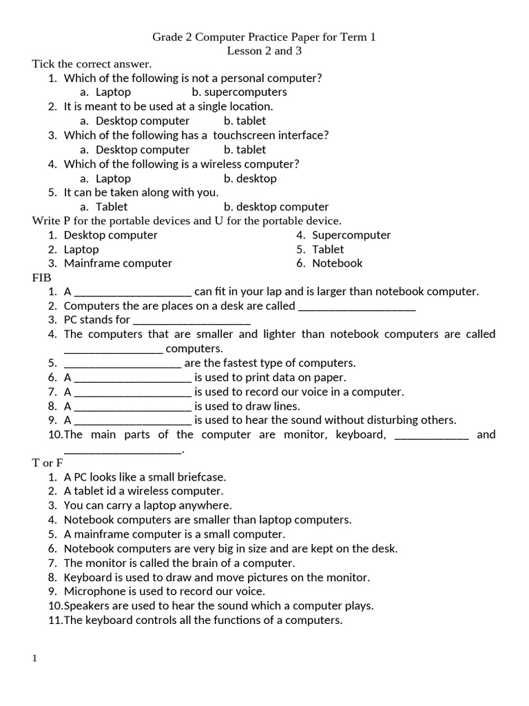 Grade 2 Computer Practice Paper for Term 1