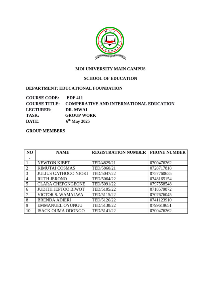 COURSE TITLE: COMPERATIVE AND INTERNATIONAL EDUCATION
