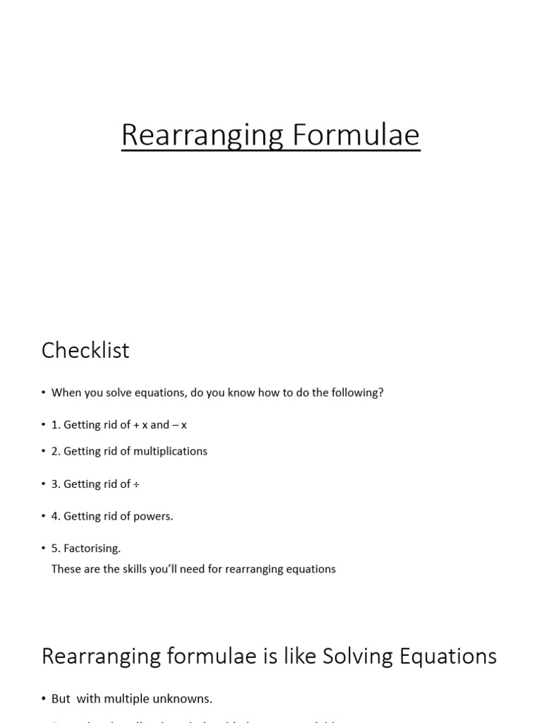 • When we rearrange formulas we always want to get one variable (a, x, etc) on its own.