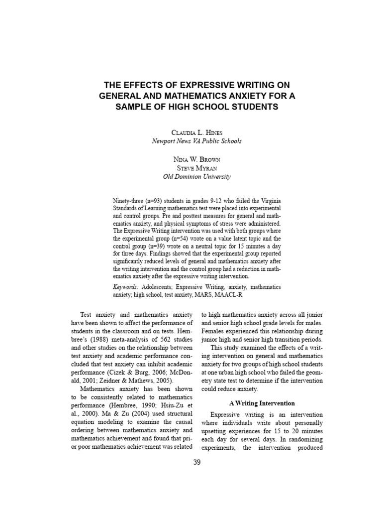 Keywords: Adolescents; Expressive Writing, anxiety, mathematics