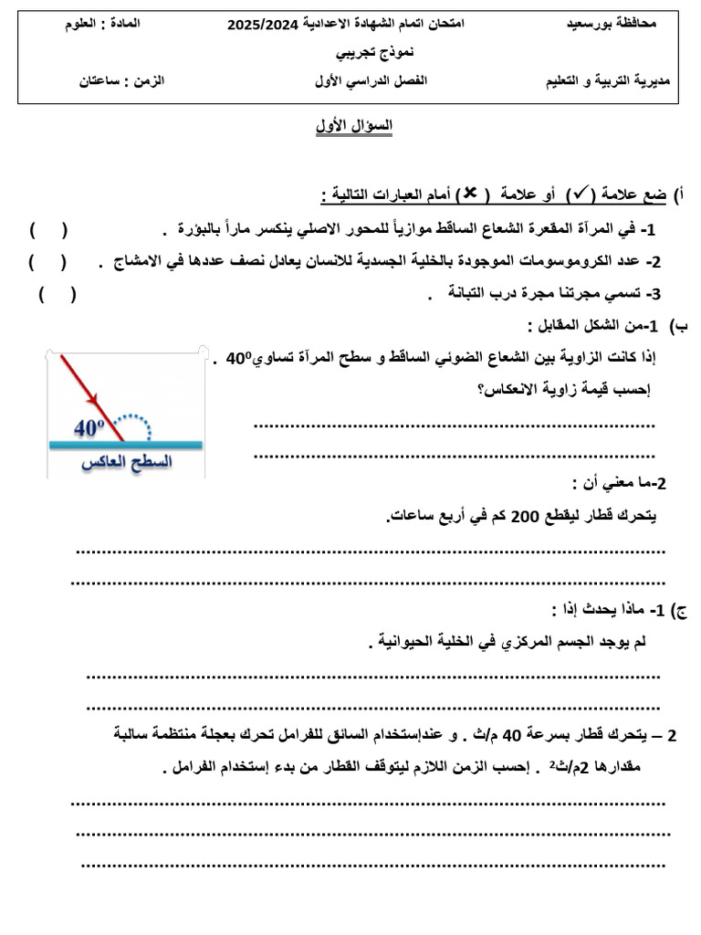 المادة :العلوم امتحان اتمام الشهادة االعدادية 2025/2024 محافظة بورسعيد