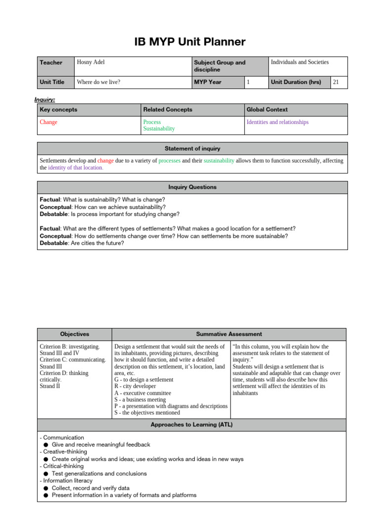 Unit Title Where do we live? MYP Year 1 Unit Duration (hrs) 21