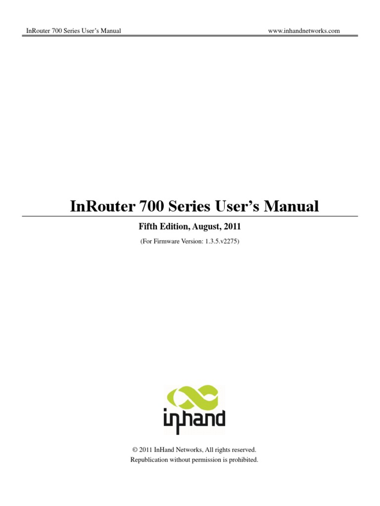 Inrouter 700 Series User'S Manual: Fifth Edition, August, 2011