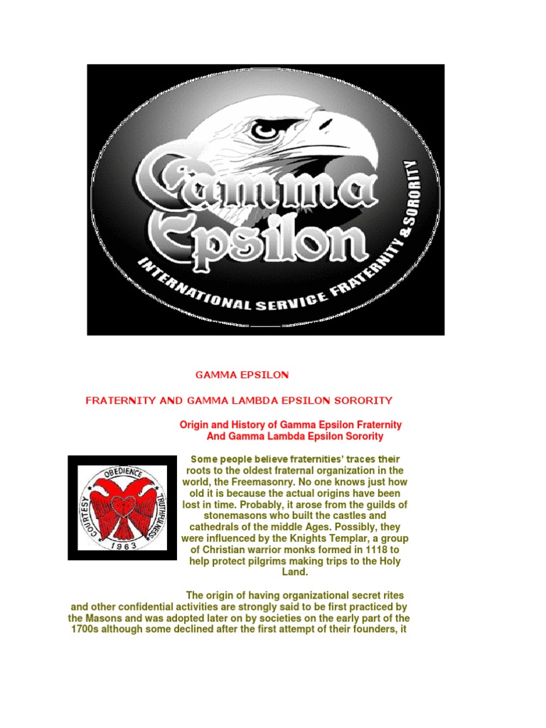 Fraternity And Gamma Lambda Epsilon Sorority AND GAMMA LAMBDA EPSILON Some people believe fraternities traces their roots to the oldest fraternal organization in the world, the Freemasonry. No one knows just how old it is because the actual origins have been lost in time. Probably, it arose from the guilds of stonemasons who built the castles and cathedrals of the middle Ages. Possibly, they were influenced by the Knights Templar, a group of Christian warrior monks formed in 1118 to help protect pilgrims making trips to the Holy Omega Alpha, Land. Omega Chi, Omega Delta Chapter The origin of having organizational secret rites and other confidential activities are strongly said to be first practiced by the Masons and was adopted later on by societies on the early part of the 1700s although some declined after the first attempt of their founders, it