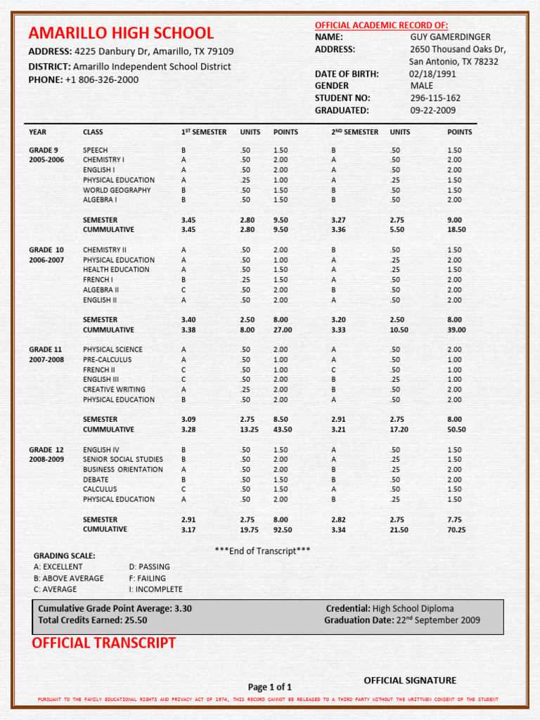 Cumulative Grade Point Average: 3.30 Credential: High School Diploma