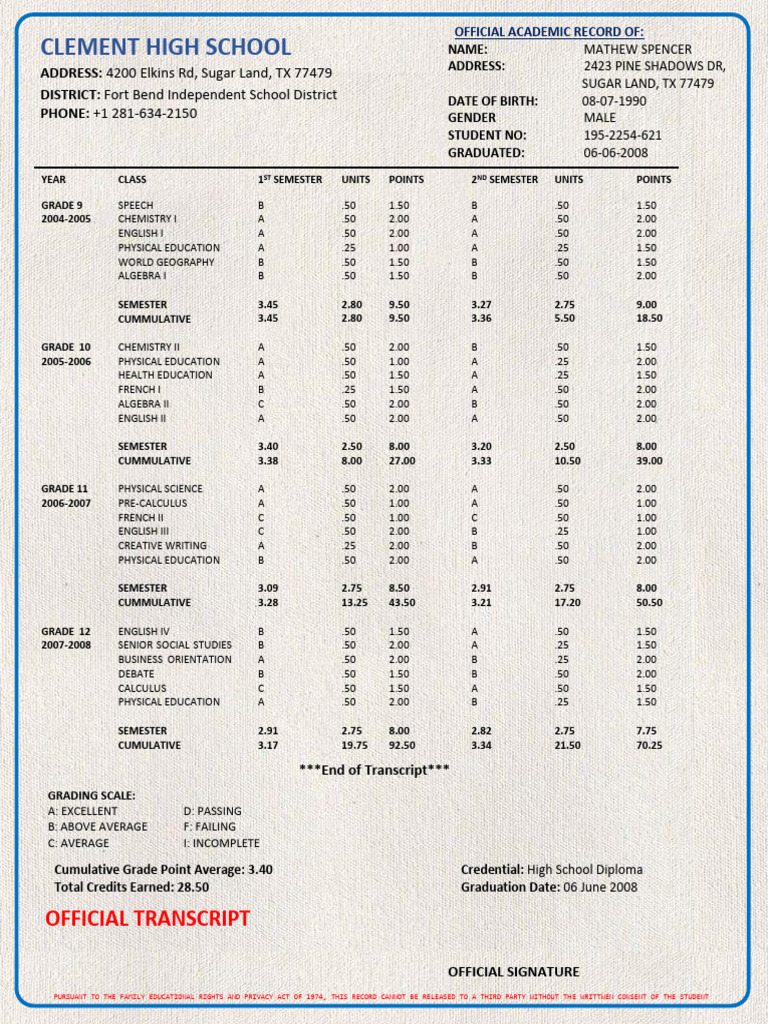 Cumulative Grade Point Average: 3.40 Credential: High School Diploma