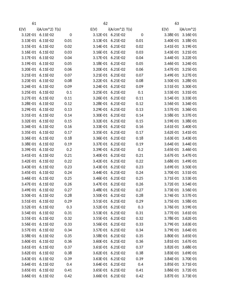E(V) i(A/cm^2) T(s) E(V) i(A/cm^2) T(s) E(V) i(A/cm^2)