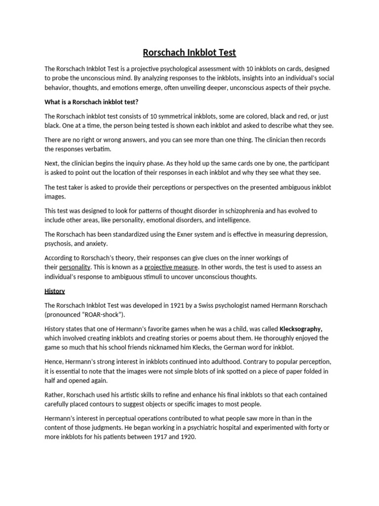 The Rorschach Inkblot Test is a projective psychological assessment with 10 inkblots on cards, designed