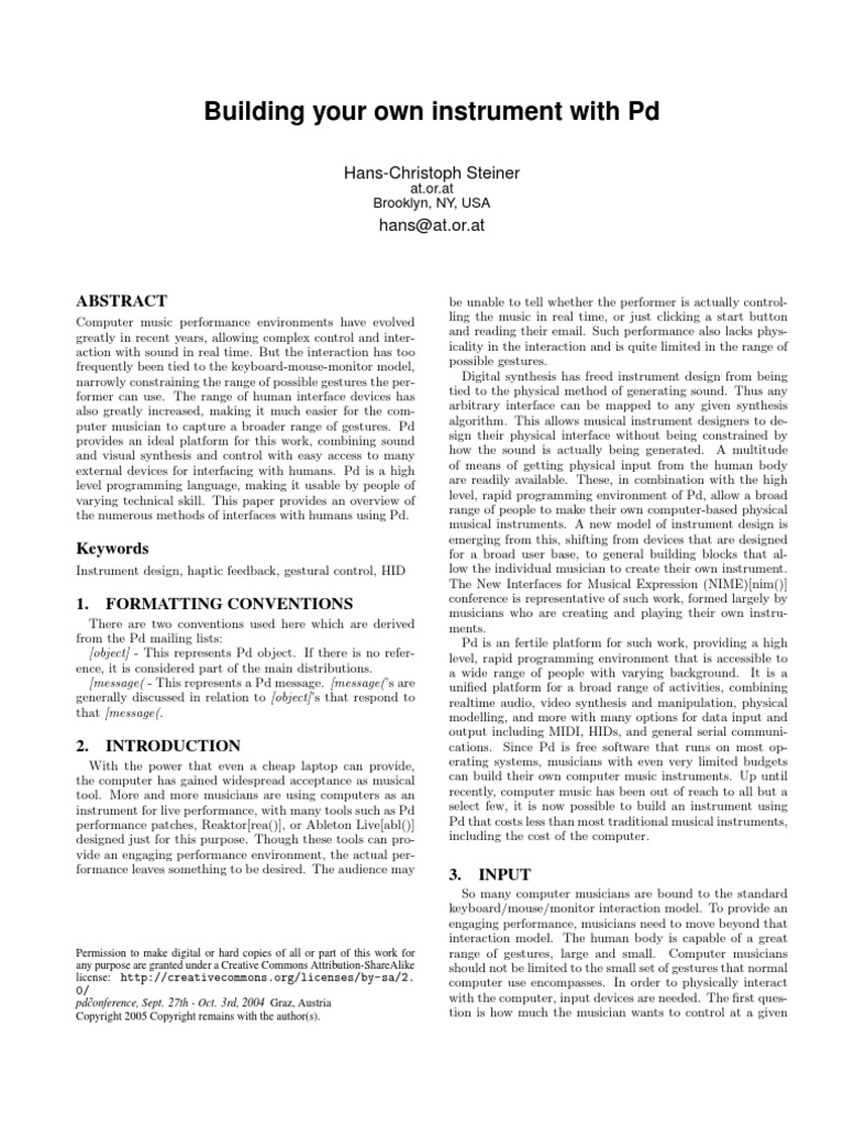 be unable to tell whether the performer is actually controlling the music in real time, or just clicking a start button and reading their email. Such performance also lacks physicality in the interaction and is quite limited in the range of possible gestures. Digital synthesis has freed instrument design from being tied to the physical method of generating sound. Thus any arbitrary interface can be mapped to any given synthesis algorithm. This allows musical instrument designers to design their physical interface without being constrained by how the sound is actually being generated. A multitude of means of getting physical input from the human body are readily available. These, in combination with the high level, rapid programming environment of Pd, allow a broad range of people to make their own computer-based physical musical instruments. A new model of instrument design is emerging from this, shifting from devices that are designed for a broad user base, to general building blocks that allow the individual musician to create their own instrument. The New Interfaces for Musical Expression (NIME)[nim()] conference is representative of such work, formed largely by musicians who are creating and playing their own instruments. Pd is an fertile platform for such work, providing a high level, rapid programming environment that is accessible to a wide range of people with varying background. It is a unied platform for a broad range of activities, combining realtime audio, video synthesis and manipulation, physical modelling, and more with many options for data input and output including MIDI, HIDs, and general serial communications. Since Pd is free software that runs on most operating systems, musicians with even very limited budgets can build their own computer music instruments. Up until recently, computer music has been out of reach to all but a select few, it is now possible to build an instrument using Pd that costs less than most traditional musical instruments, including the cost of the computer.