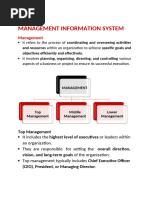 MIS helps the management to take decisions in the following fields: 1. To carry out study, in order to provide information about the competitors, their share in the market, prices [Link] will enable the management to take decision about the quality, quantity and sales price of the product to be produced. 2. To acquire knowledge about new processes and technologies developed. 3. Forecasting. 4. Inventory management. 5. To permit management by exception. 6. To prepare long range plans. 7. To find out new opportunities. 8. Scheduling problems. 9. Reservation system being operated in Airlines. 10. To allocate capital resources. 28