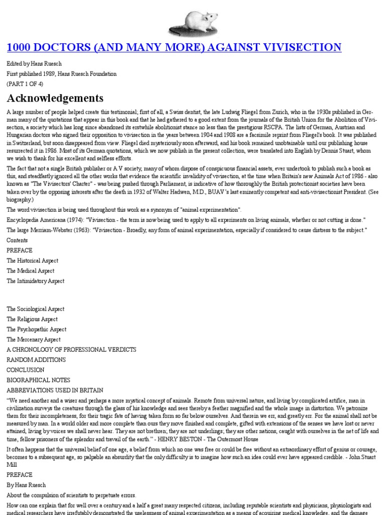 A list of doctors who signed their opposition to vivisection in the years between 1904 and 1908 is a facsimile reprint from the late Ludwig Fliegel from Zurich. The word "vivisection" is being used throughout this work as a synonym of "animal experimentation" the book is based on the work of a number of prominent doctors who were opposed to the practice.