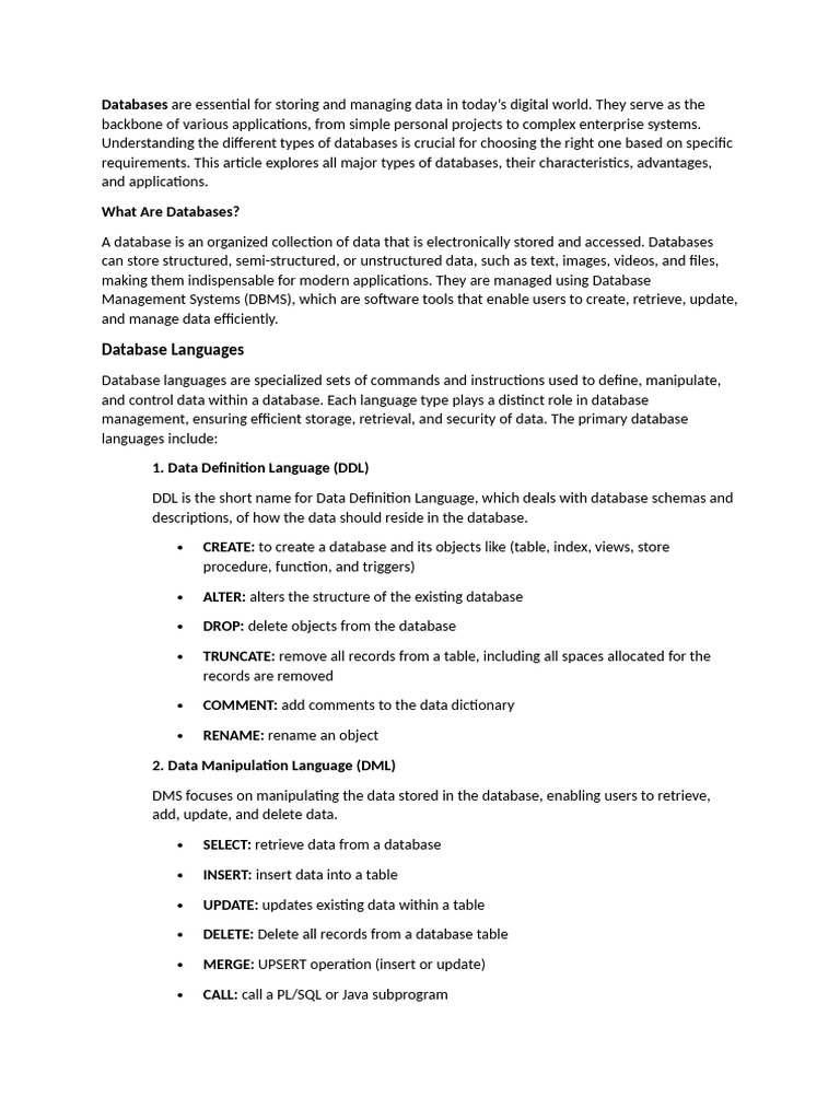 requirements. This article explores all major types of databases, their characteristics, advantages,
