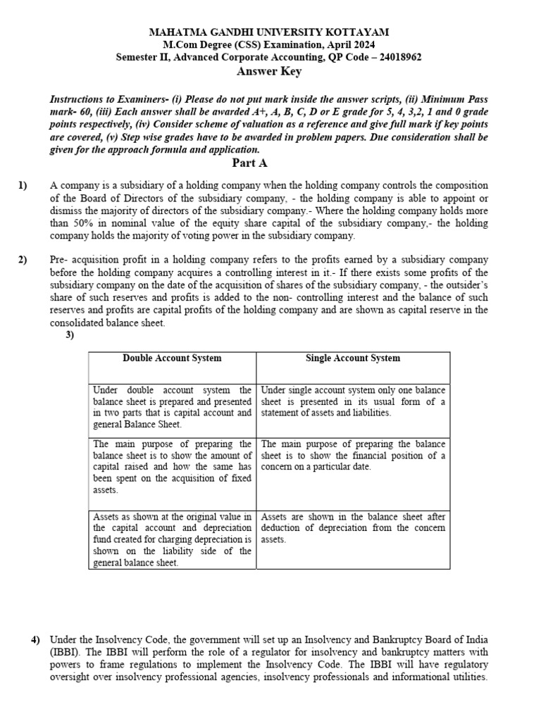 Answer Key: Mahatma Gandhi University Kottayam Semester II, Advanced Corporate Accounting, QP Code - 24018962
