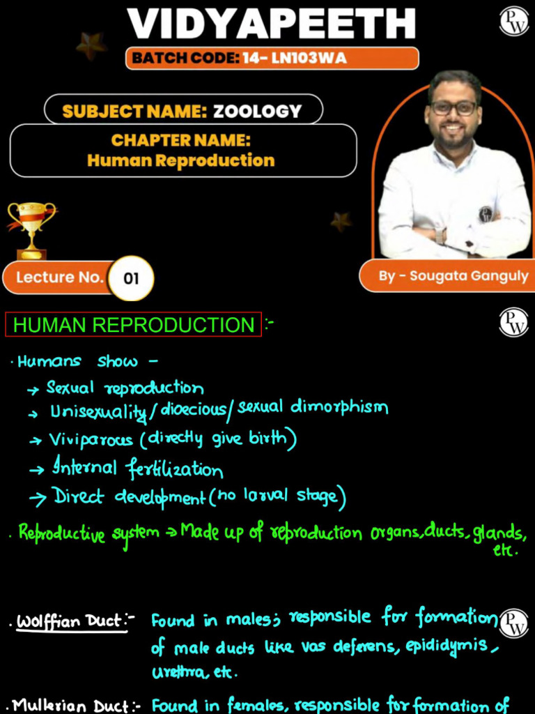 The document discusses human reproduction, focusing on the male and female reproductive systems, including anatomy, reproductive organs, and processes such as spermatogenesis and ovulation. It outlines the structures involved in reproduction, such as testes, ovaries, and accessory ducts, as well as the hormonal and physiological changes that occur during reproduction. Additionally, it touches on various reproductive health topics and the importance of temperature regulation in sperm production.
