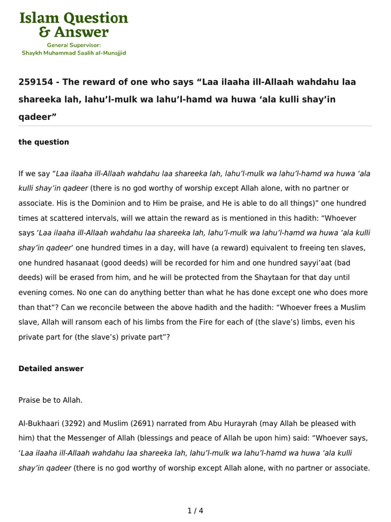 shay’in qadeer’ one hundred times in a day, will have (a reward) equivalent to freeing ten slaves,