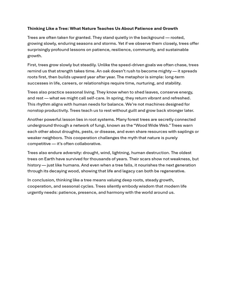In conclusion, thinking like a tree means valuing deep roots, steady growth,