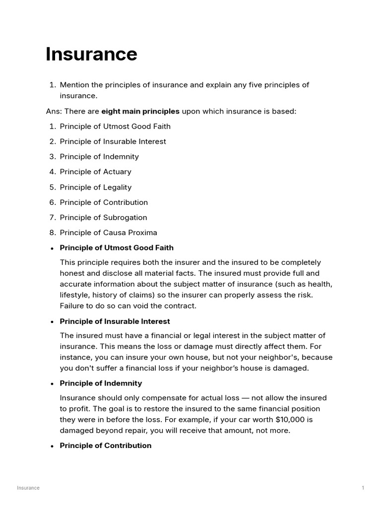 1. Mention the principles of insurance and explain any five principles of