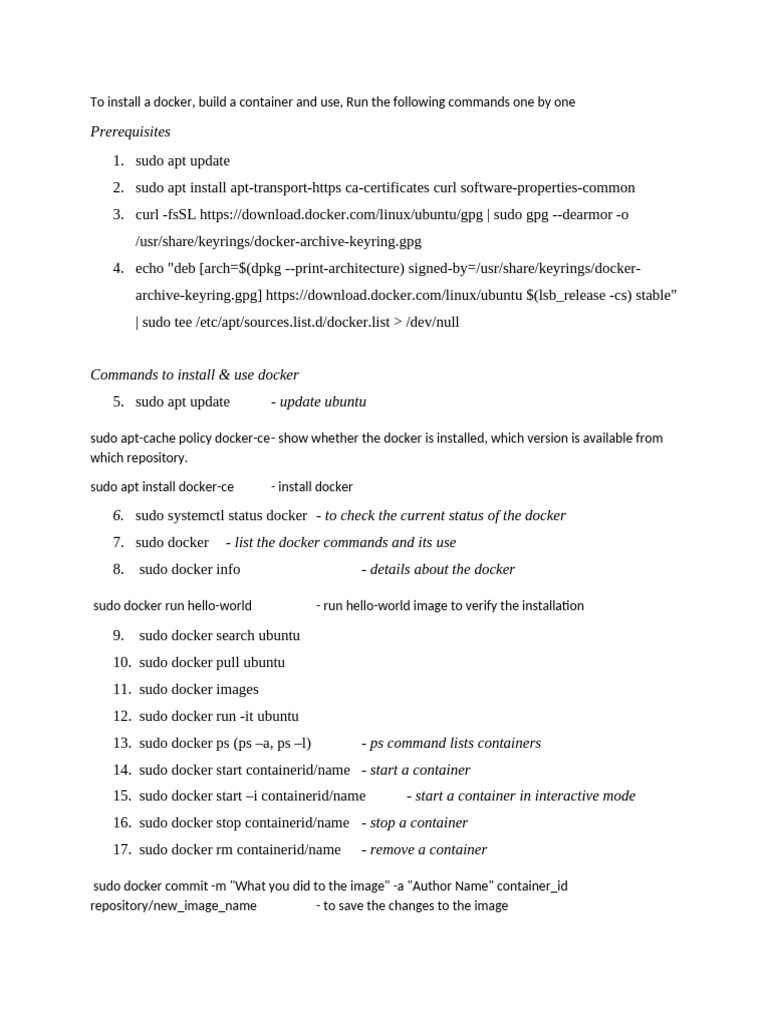 Commands to install & use docker