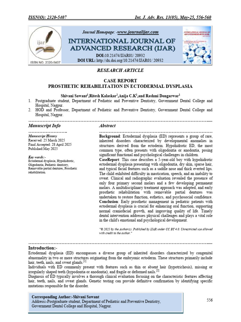 2. Dimple P, Khade A, Takate V, Dighe K, Singh S. Hypohidrotic hereditary ectodermal dysplasia: A case report. IP
