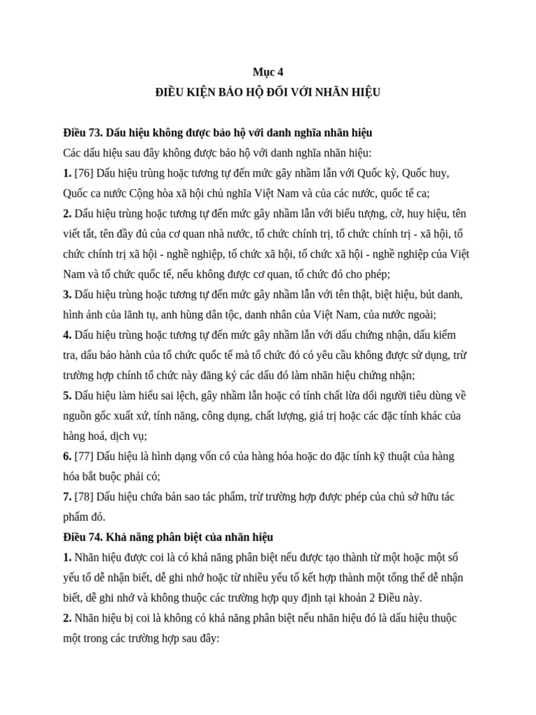 Điều 73. Dấu hiệu không được bảo hộ với danh nghĩa nhãn hiệu