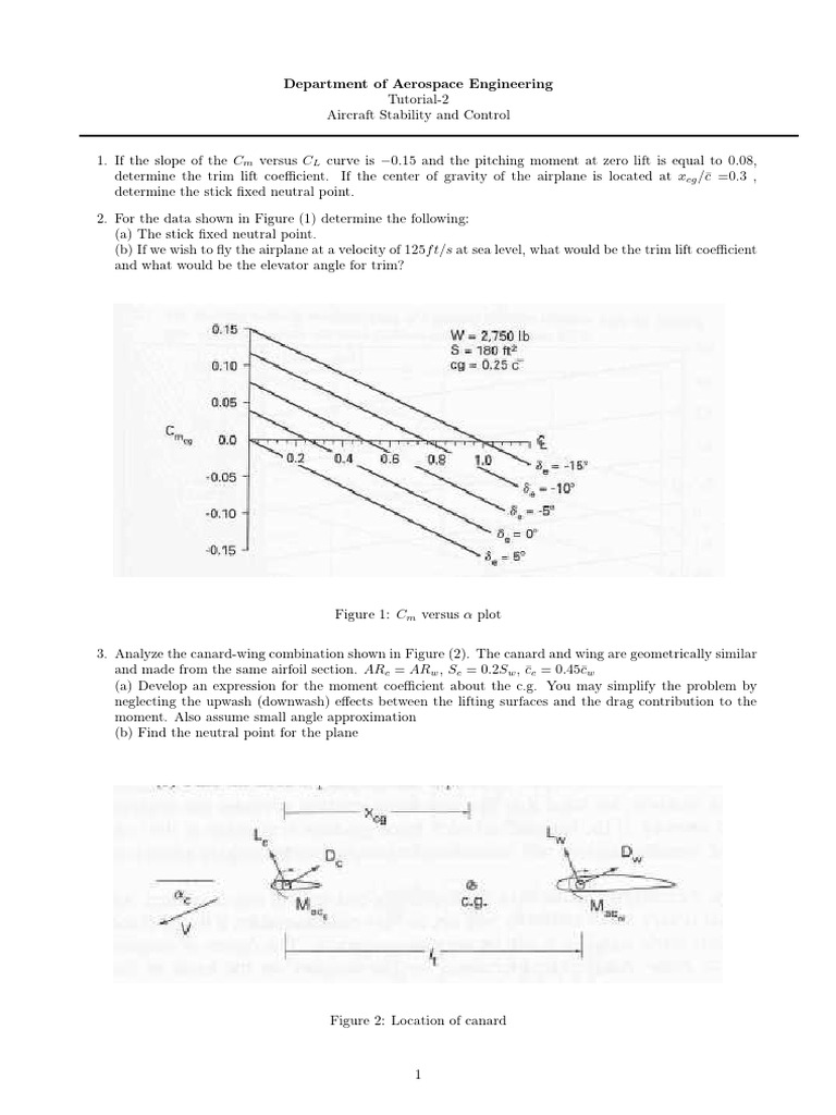 1. If the slope of the Cm versus CL curve is −0.15 and the pitching moment at zero lift is equal to 0.08,