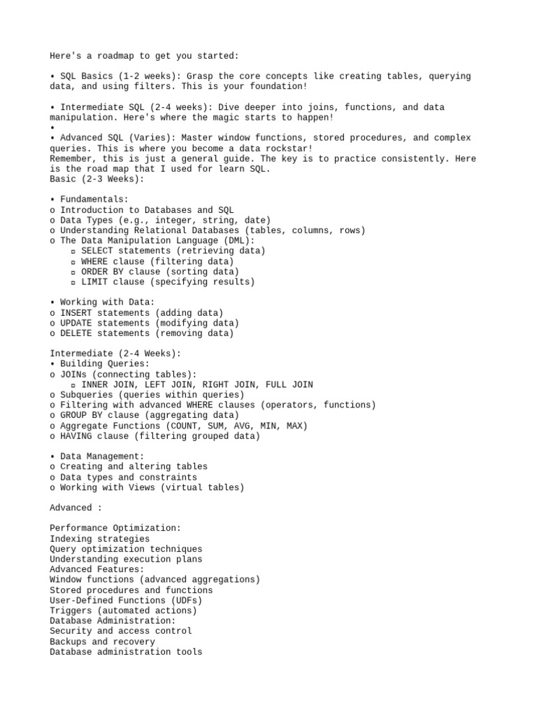 • Advanced SQL (Varies): Master window functions, stored procedures, and complex