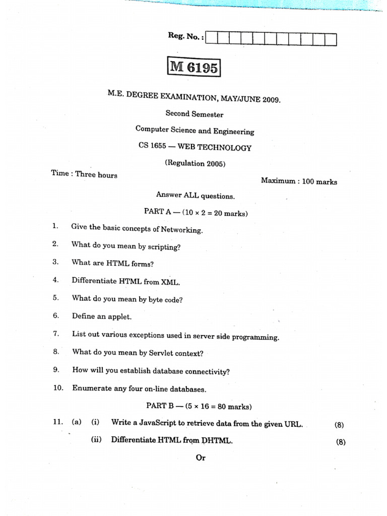 The document outlines the examination structure for a Computer Science and Engineering course on Web Technology, including a variety of topics such as networking, scripting, HTML forms, applets, and database connectivity. It consists of two parts: Part A with short answer questions and Part B with detailed questions requiring in-depth explanations and examples. The exam tests knowledge on JavaScript, CGI, server-side programming, exception handling, and various web technologies.