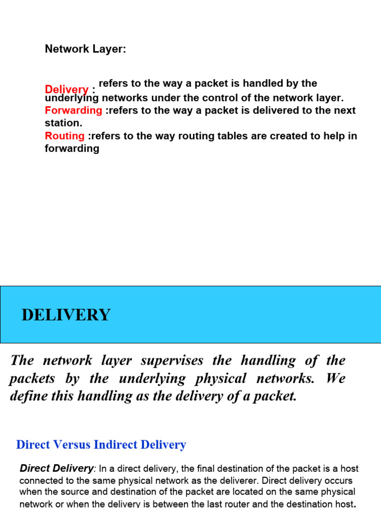 Direct Delivery: In a direct delivery, the final destination of the packet is a host
