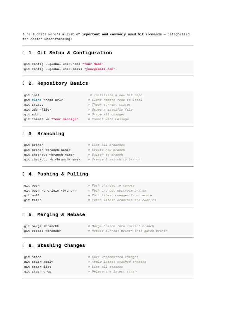 Here's a list of important and commonly used Git commands — categorized