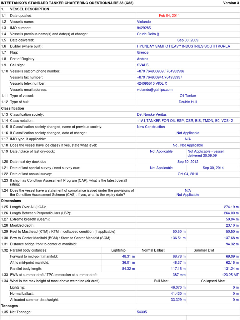 INTERTANKO'S STANDARD TANKER CHARTERING QUESTIONNAIRE 88 (Q88) Version 3