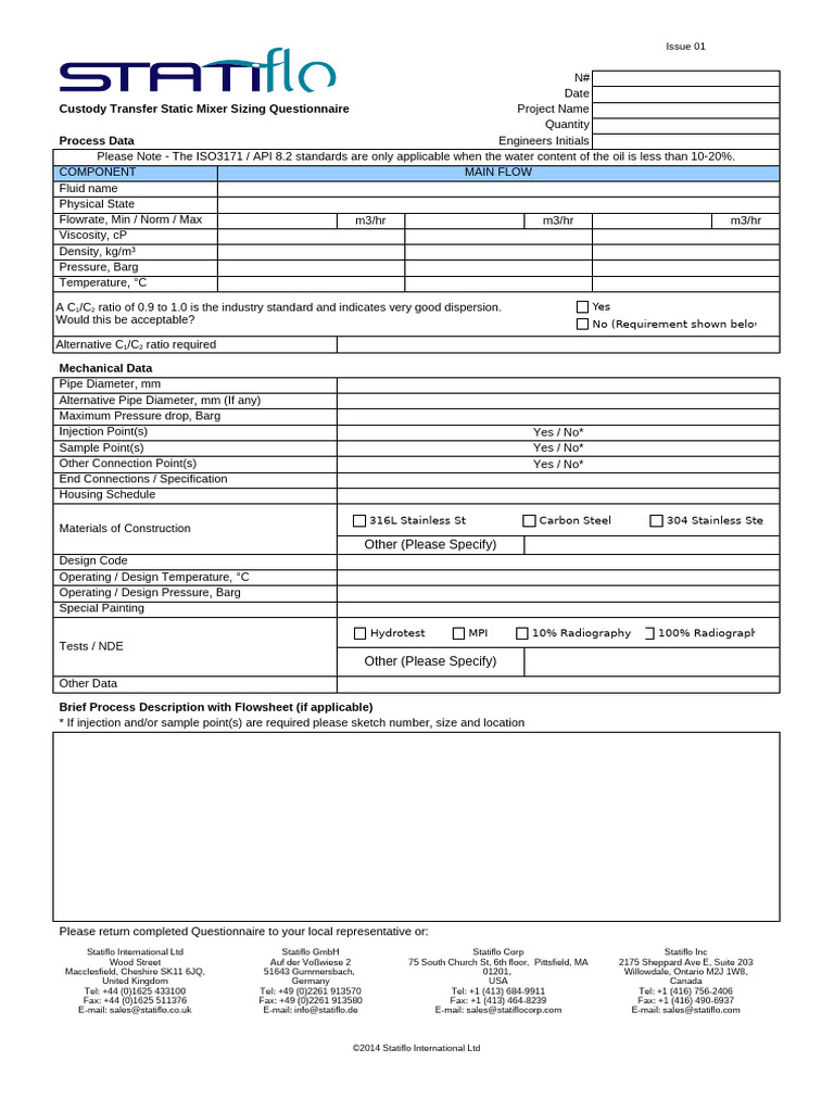 Custody Transfer Static Mixer Sizing Questionnaire Project Name