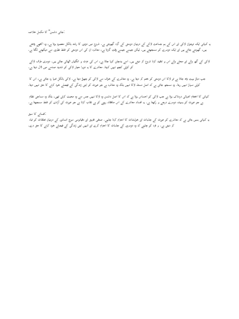ہے جو عورت کو ہمیشہ دوسرے درجے پر رکھتا ہے۔ یہ افسانہ معاشرے کے اس منافقانہ رویے کو بے نقاب کرتا ہے جو عورت کی آزادی کو غلط سمجھتا ہے۔