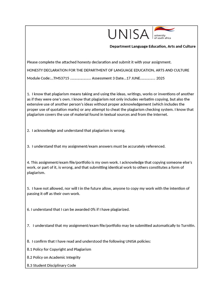 HONESTY DECLARATION FOR THE DEPARTMENT OF LANGUAGE EDUCATION, ARTS AND CULTURE