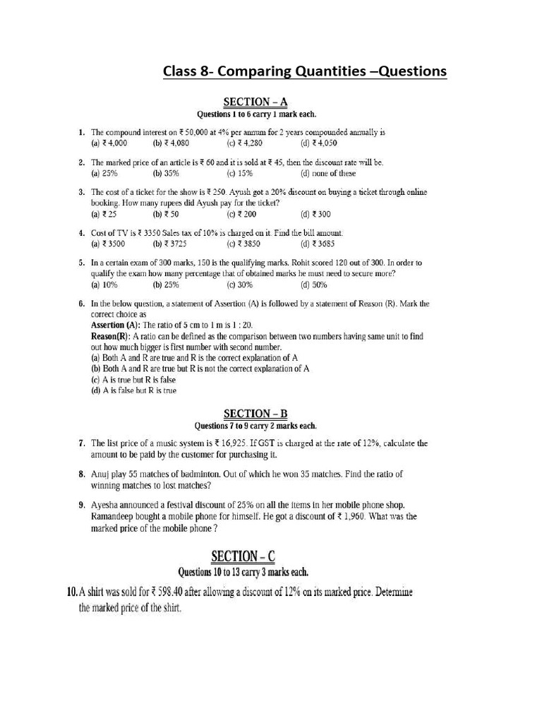 The document contains questions related to comparing quantities for Class 8 students. It focuses on mathematical concepts and problem-solving skills. The questions are designed to enhance understanding of ratios, percentages, and proportions.